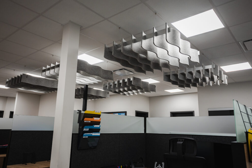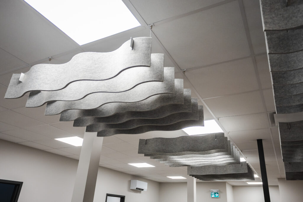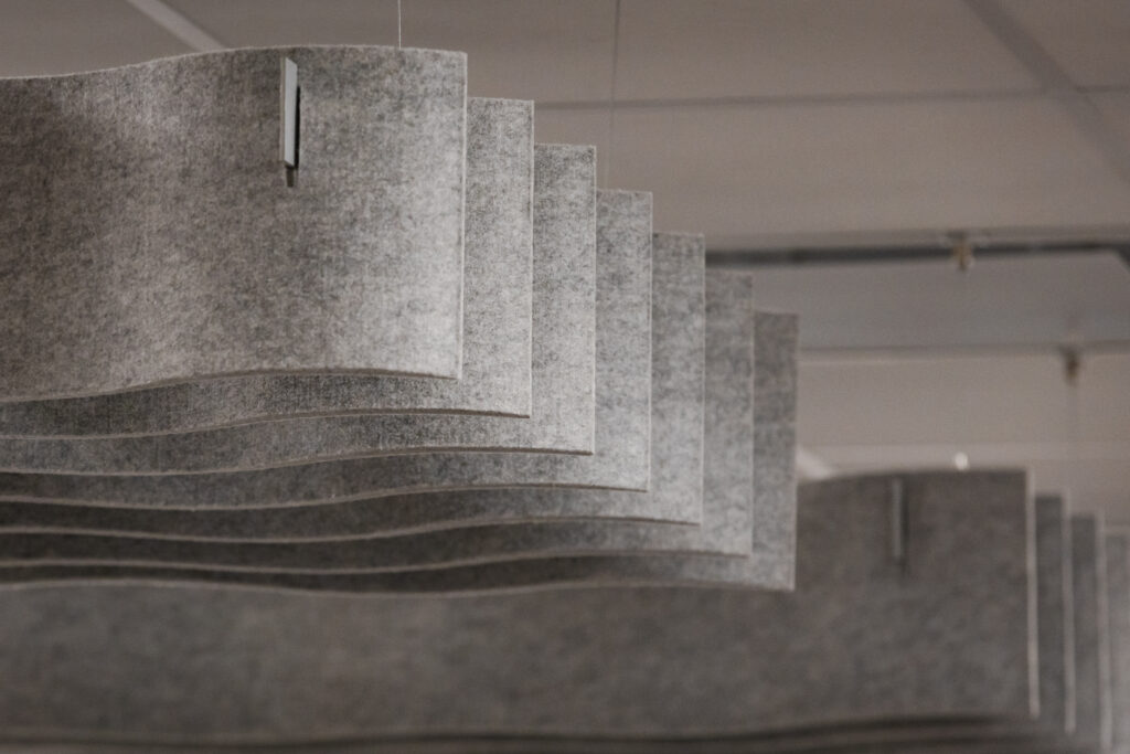 Au cœur de cette transformation, nos plafonniers acoustiques suspendus Quiet Curve ont été installés afin de réduire la réverbération et d’apporter une touche visuelle distinctive. Leur design ondulé ajoute une dimension sculpturale qui complète parfaitement l’aménagement intérieur, tout en offrant une performance acoustique remarquable.