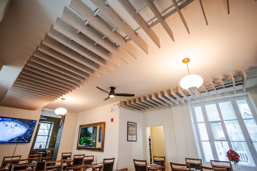In a restaurant where conversation and conviviality are central to the experience, controlling ambient noise to allow guests to comfortably interact—even during peak hours—became a priority. Within the indoor dining areas, several acoustic challenges were identified :